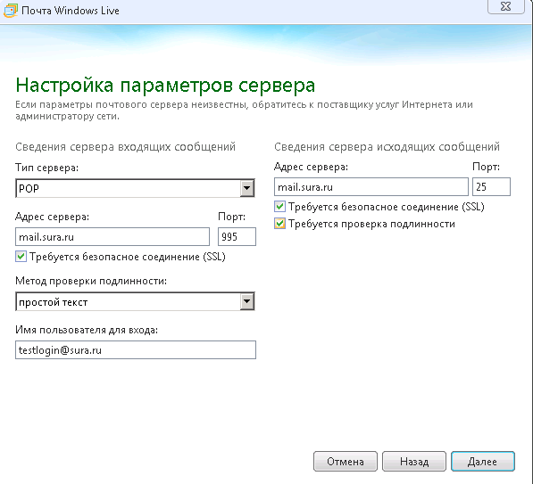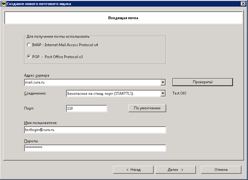 | Сервер входящей почты (POP3, IMAP сервер) | mail.samtel.ru |