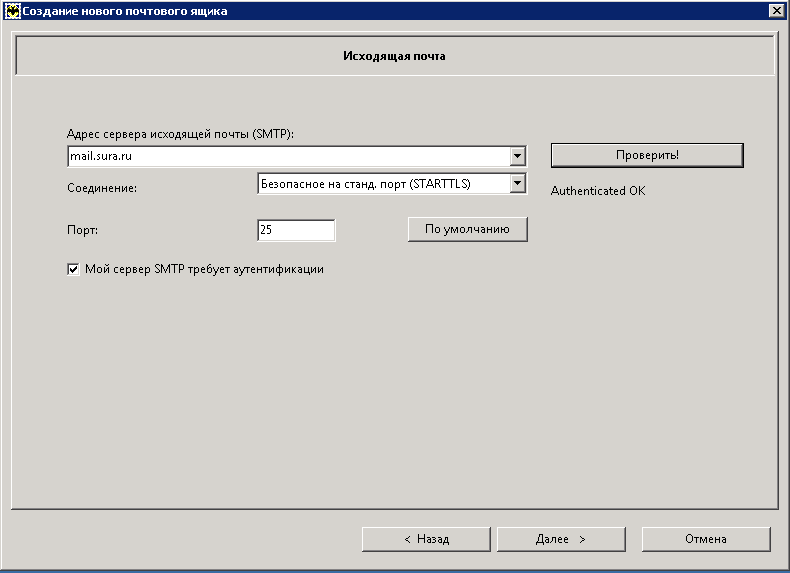 | Сервер исходящей почты (SMTP сервер) | mail.samtel.ru |